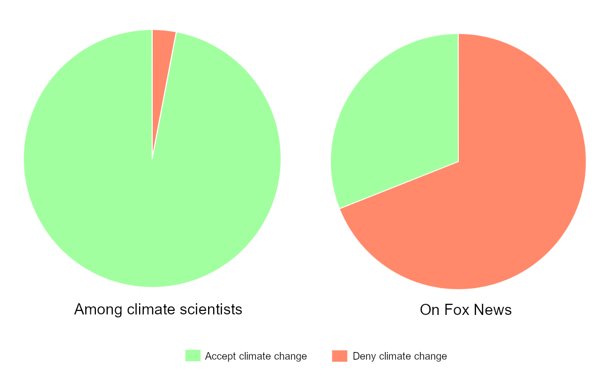 The debate over climate change and climate science has been a very contentious debate between those who support climate initiatives and those who deny the existence of climate change. It is honest to say that the majority of those who support climate initiatives are “liberal” or “progressive” and that the majority of climate change deniers are “conservative” or “Republican”. The media has created a bias in reporting on this issue due to their attempts to give equal airtime to the environmental advocacy groups and their ideas and climate change deniers and their ideas. This bothsidesism was bias, not fair reporting. Why? The media framed the issue as being 50/50, when in reality, there is an overwhelming scientific consensus supporting the existence of human-caused climate change, as well as its real impact. This bothsidesism gave conservatives a level playing field that they did not deserve.